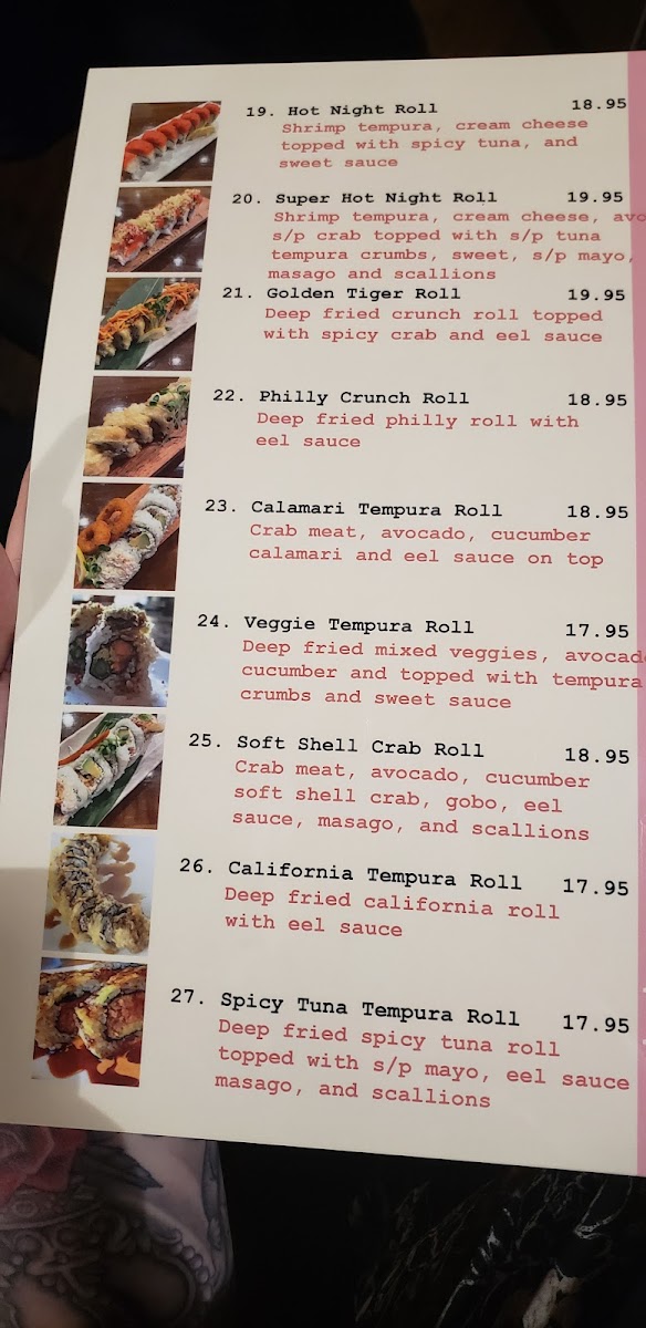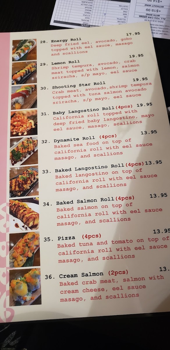 - Special Rolls: These rolls feature creative combinations including ingredients like crab meat, avocado, shrimp tempura, tuna, salmon, eel sauce, and spicy mayo. Examples include the Shooting Star Roll, Hot Night Roll, Lemon Roll, and Energy Roll, providing a range of flavors and textures.